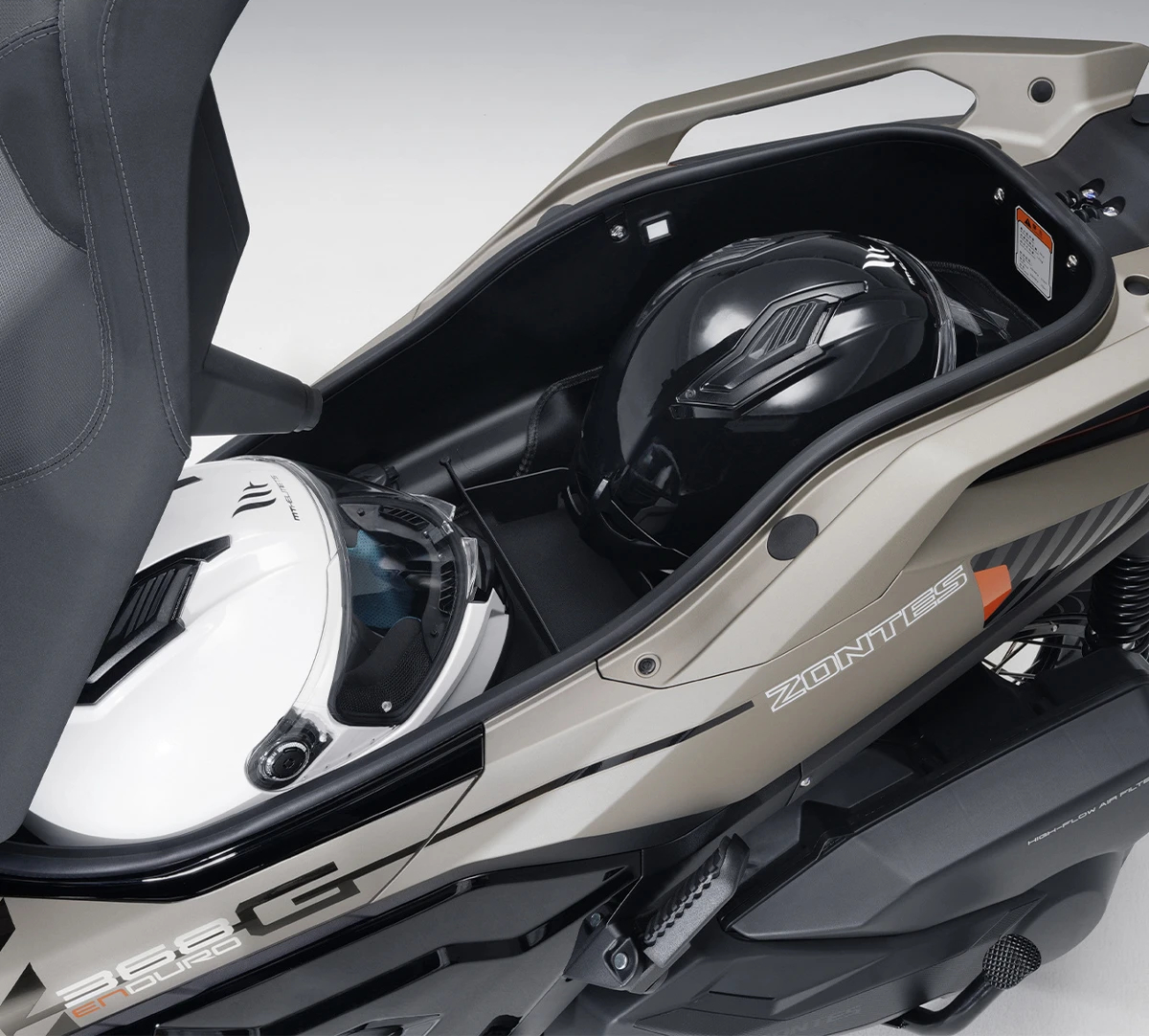 - Rymligt förvaringsutrymme under sätet med plats för två integralhjälmar.