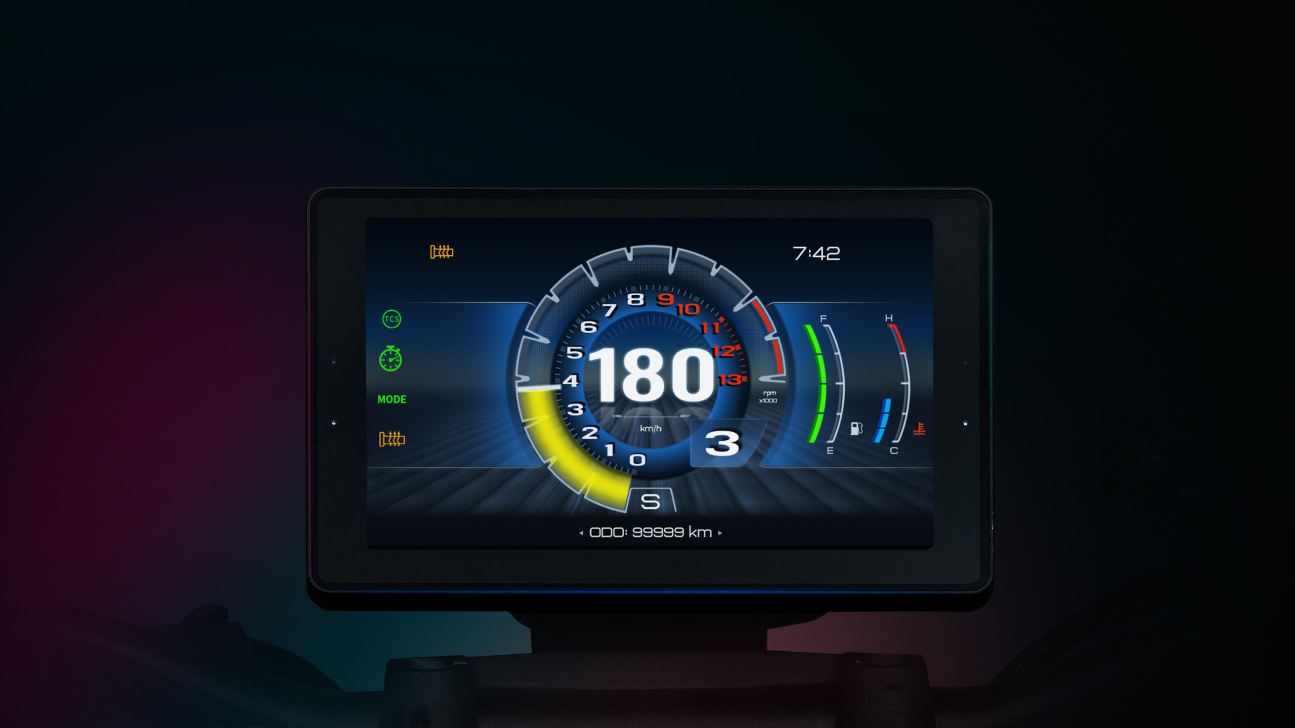 - 6,75-tums TFT-display med konfigurerbar layout, som visar information som däcktryck och temperatur, navigering och anslutningsmöjligheter.